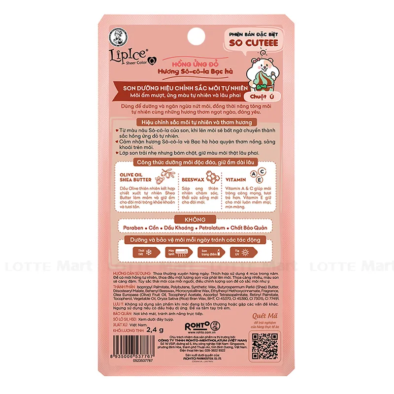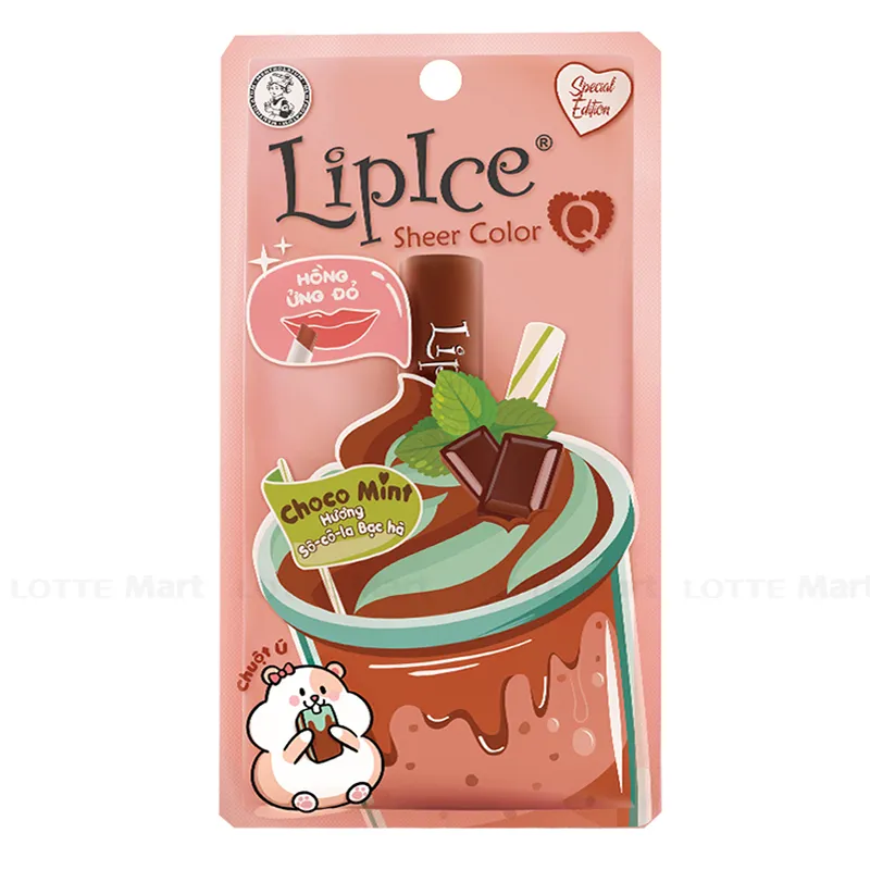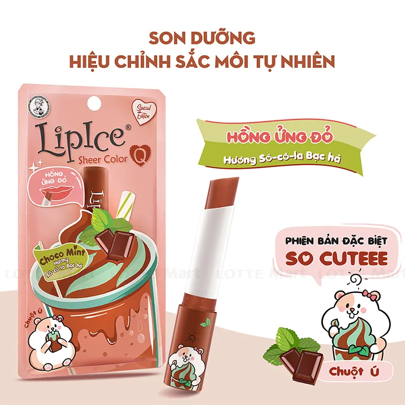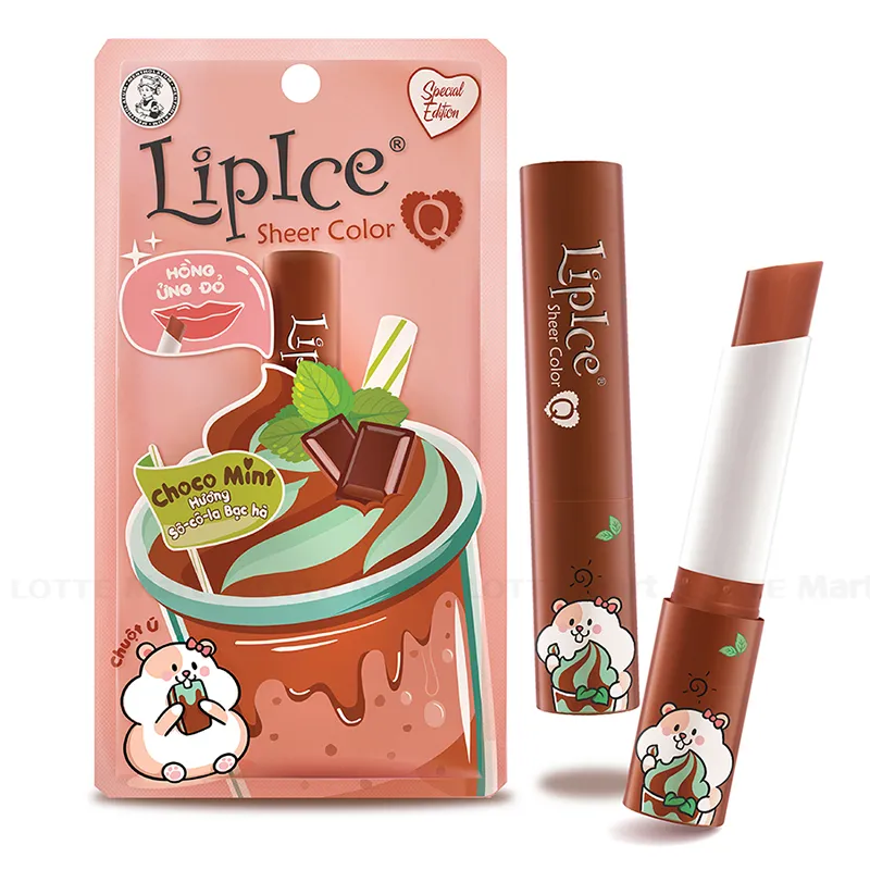 Son dưỡng màu Lip Ice Sheer Color Q Choco Mint từ màu nâu của Choco Mint khi thoa lên môi chuyển thành sắc hồng trong như môi em bé. Dưỡng môi ẩm mượt suốt ngày dài với hương vị kẹo ngọt ngào đầy quyến rũ.