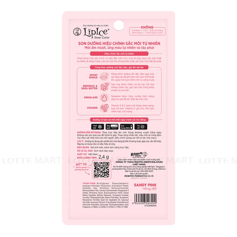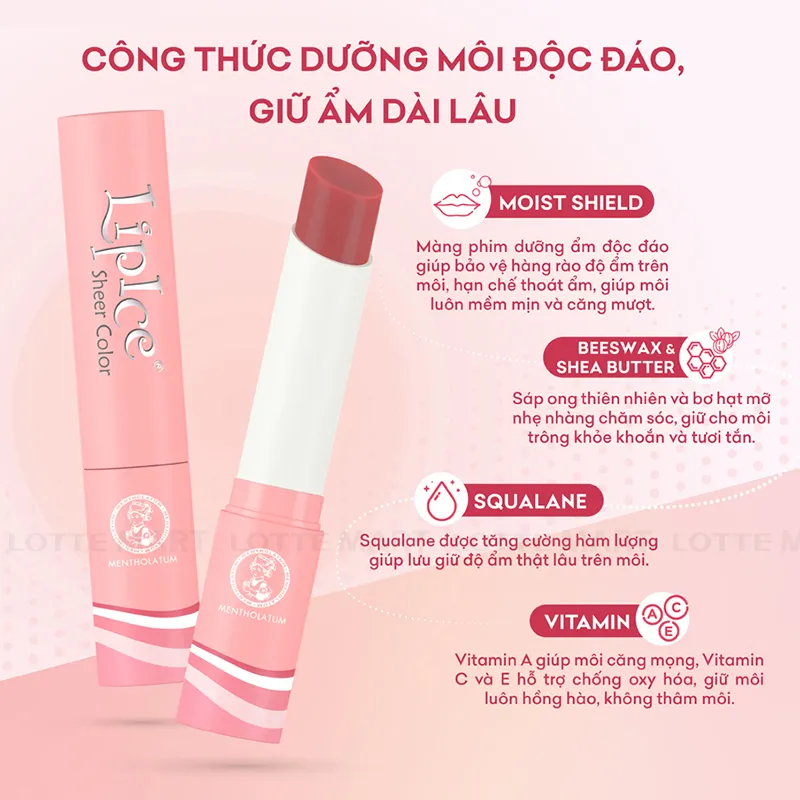- BEESWAX & SHEA BUTTER: Sáp ong thiên nhiên và bơ hạt mỡ nhẹ những chăm sóc, giữ cho môi trắng khỏe khoản và tươi tắn.