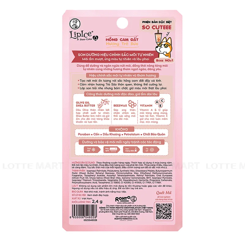 Son Dưỡng Môi LipIce Hương Trà Sữa Màu Hồng Cam Đất 2.4G với hương Trà Sữa thân quen không chỉ giúp dưỡng ẩm môi mà còn tạo cho bạn đôi môi căng mọng. Màu hồng cam đất đầy cá tính cùng khả năng bám lâu giúp bạn thêm tự tin suốt ngày dài.