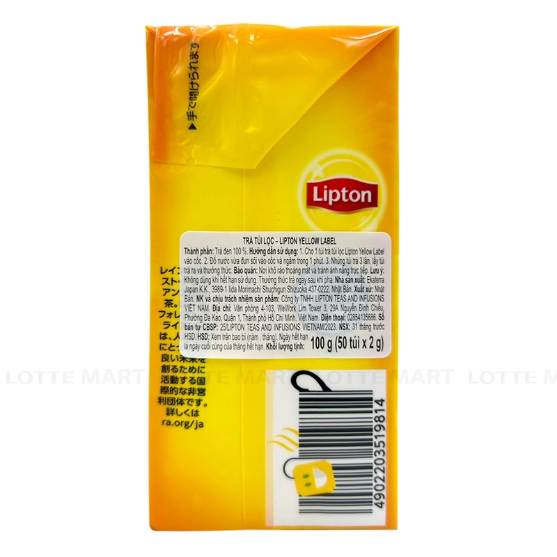 - Trà Túi Lọc Lipton Nhãn Vàng Hộp 50 Túi 2G làm từ 100% trà đen được thu hái từ các vườn trà chọn lọc, cho hương vị thơm ngon độc đáo khi thưởng thức. Sản phẩm sản xuất trên dây chuyền công nghệ hiện đại và trải qua quy trình kiểm soát nghiêm ngặt, Trà túi lọc Lipton nhãn vàng đảm bảo an toàn cho sức khỏe người dùng.