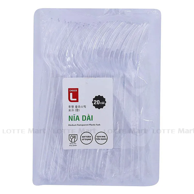 - Nĩa Nhựa Trong Dài Choice L Dùng Một Lần Lốc 20 Cái được làm bằng chất liệu nhựa PE sử dụng được cho thức ăn nóng và lạnh, rất an toàn, không gây độc hại với người sử dụng.