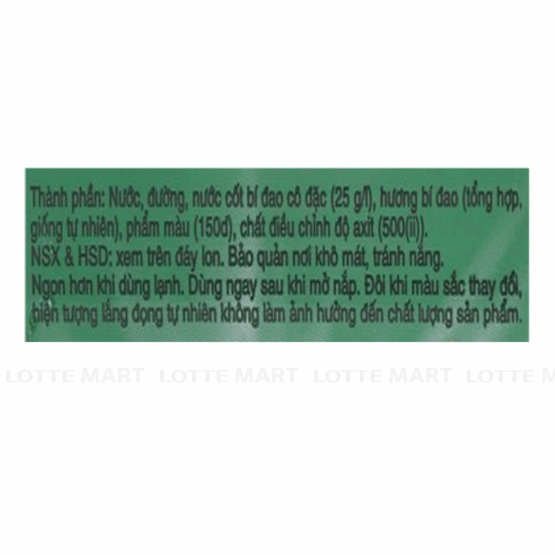 - Nước, đường, nước cốt bí đao cô đặc, màu tự nhiên,...