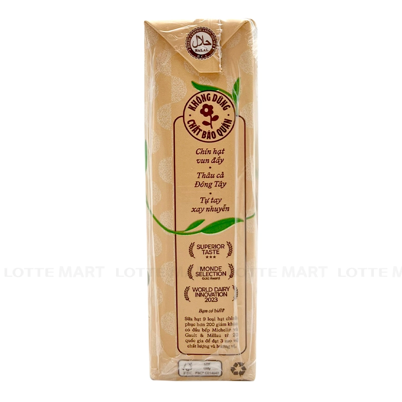 - Sữa hạt (>94%) (nước, dịch trích từ hạt đậu nành, dầu thực vật, hạnh nhân nghiền, chiết xuất đậu đỏ, đậu phộng nghiền, chiết xuất hạt óc chó, bột yến mạch, chiết xuất đậu đen, chiết xuất đậu xanh, chiết xuất đậu trắng), đường (4,7%), chất nhũ hóa (471, 460(i), 466, 415), khoáng chất (calci carbonat, natri selenit), hương ngũ cốc giống tự nhiên dùng cho thực phẩm, muối in, vitamin (natri ascorbat, E, PP, A, D3), chất điều chỉnh độ acid (500(ii)).