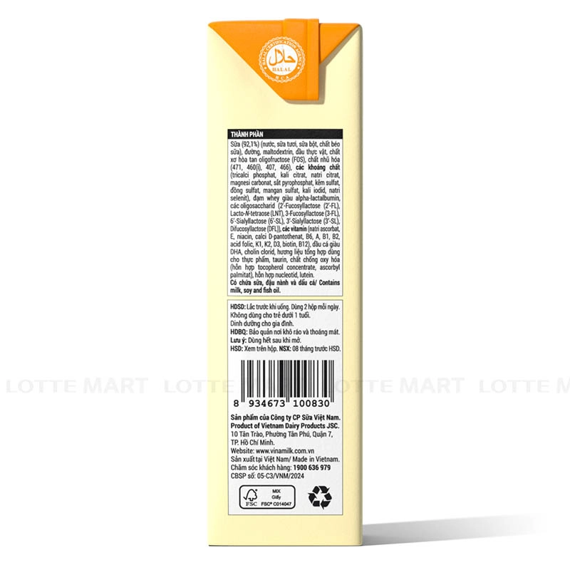 Thành phần: Nước, sữa bột (7,7%), đường tinh luyện, xirô glucoza, dầu thực vật, chất béo sữa, chất xơ hoà tan oligofructose, chất nhũ hoá (471, 460(i), 407, 466), đạm whey giàu alpha-lactalbumin, các khoáng chất (tricalci phosphat, kali citrat, natri citrat, magnesi carbonat, sắt pyrophosphate, kẽm sulfat, đồng sulfat, mangan sulfat, kali iodid, natri selenit), các vitamin...