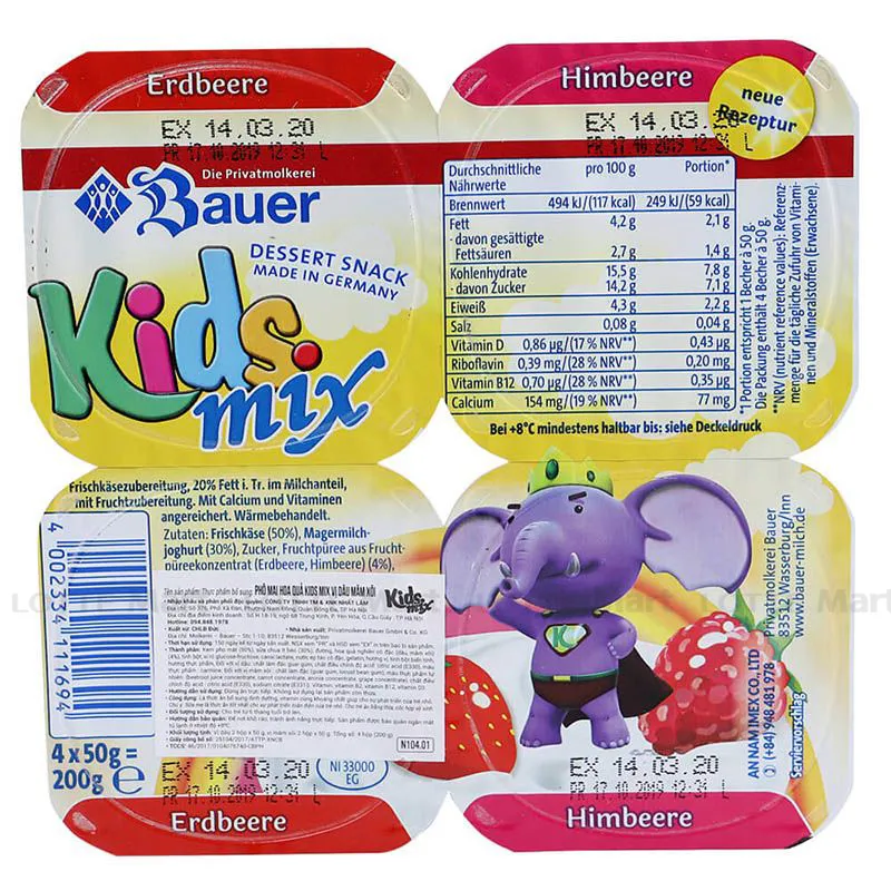 Lốc 4 Sữa Chua Ăn Hoa Quả Kids Mix Mâm Xôi 50G là sản phẩm cao cấp đến từ Đức. Sữa được lên men theo công thức đặc biệt mang lại hương vị đặc trưng của sữa và vị thơm ngọt của hoa quả. Sản phẩm được sản xuất trên dây chuyền hiện đại. Mọi khâu từ tuyển chọn nguyên liệu tới chế biến, đóng hộp đều diễn ra khép kín dưới sự giám sát và kiểm tra nghiêm ngặt của các chuyên gia về công nghệ thực phẩm, không chứa hóa chất, chất bảo quản độc hại, đảm bảo an toàn cho sức khỏe người tiêu dùng.