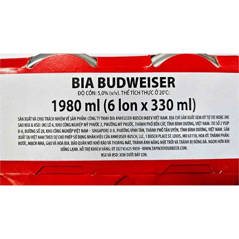 Lốc 6 Lon Bia Budweiser 5% ABV 330ml