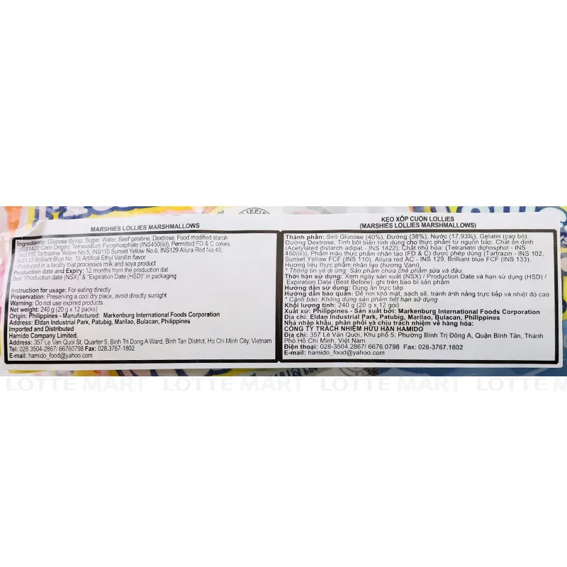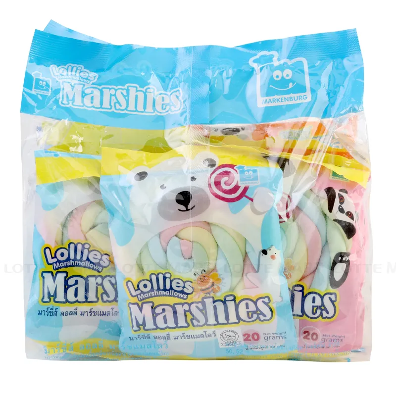 - Kẹo Marshmallow Cuộn Lollies Gói 240G là một loại kẹo bông gòn có hình dạng xoắn dài và có ba màu sắc khác nhau: hồng, trắng và xanh. Kẹo xốp, tan trong miệng rất hấp dẫn và cung cấp năng lượng, cacbonhydrat và một số vitamin có lợi cho cơ thể.
