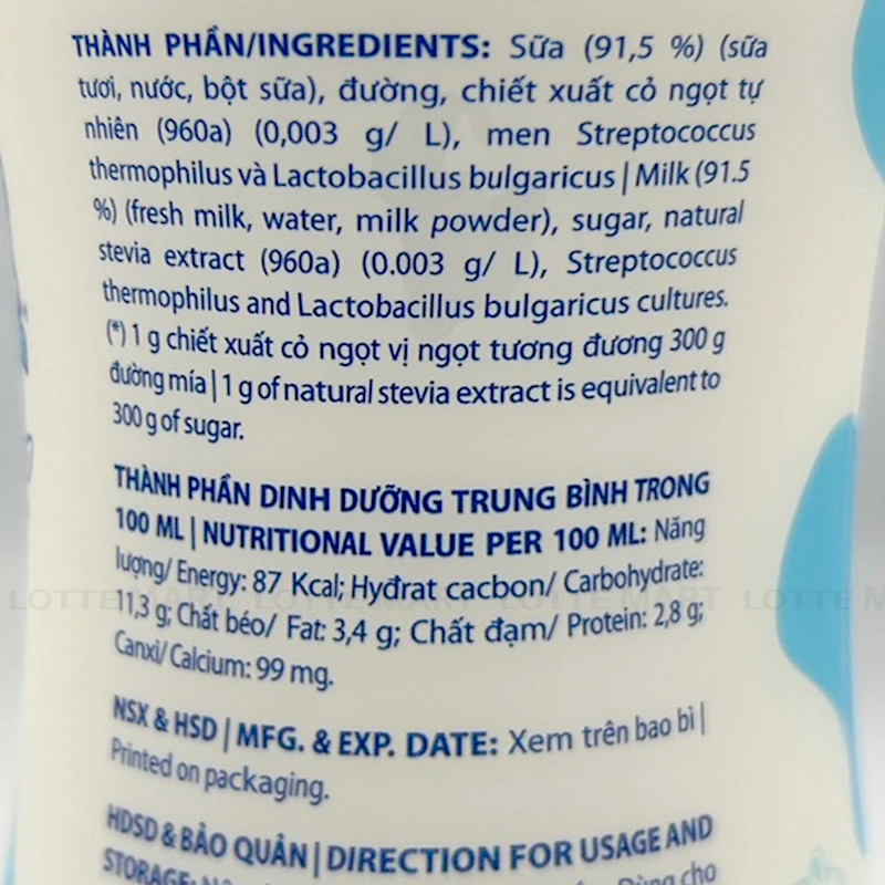 Thành phần chính: Sữa bò tươi nguyên chất 91.5%, đường RE, Men Streptoccocus thermophilus, lactobacilus,...