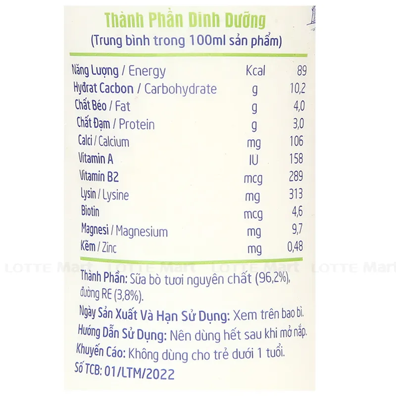 Thành phần: Sữa bò tươi nguyên chất (96,8 %), đường (3,2 %), chiết xuất cỏ ngọt tự nhiên (960a) (0,003 g/ L) / (*) 1 g chiết xuất cỏ ngọt vị ngọt tương đương 300g đường mía.