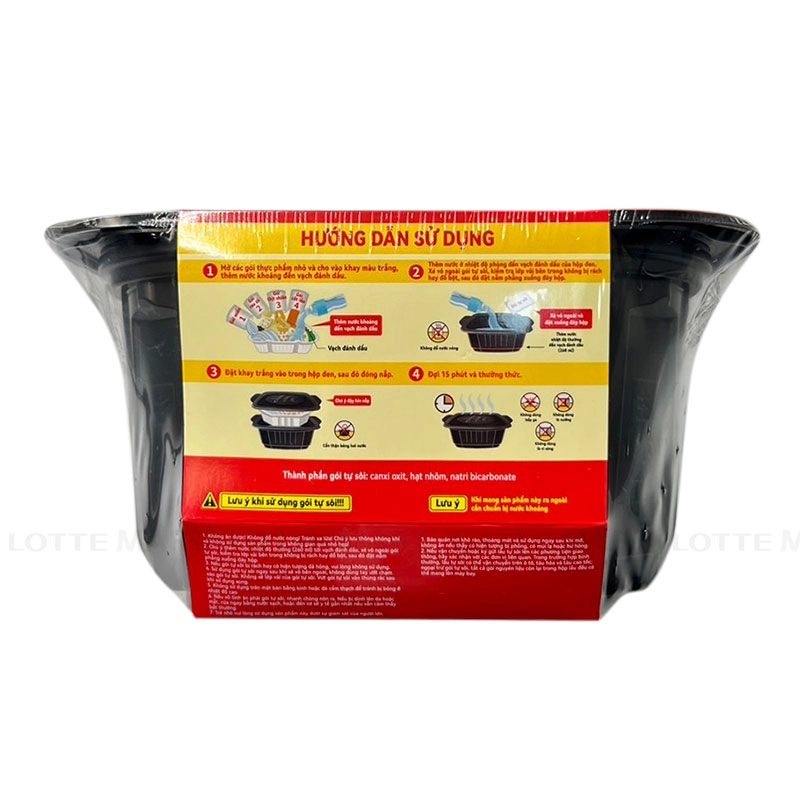 Hướng dẫn sử dụng: Cho gói đồ ăn vào khay trắng, thêm nước ở nhiệt độ thường đến vạch nước tối đa của hộp đen. Sau đó, xé vỏ của gói để tỏa nhiệt rồi đặt khay trắng vào hộp đen, đậy nắp kín trong vòng 15 phút rồi trộn đều và thưởng thức.