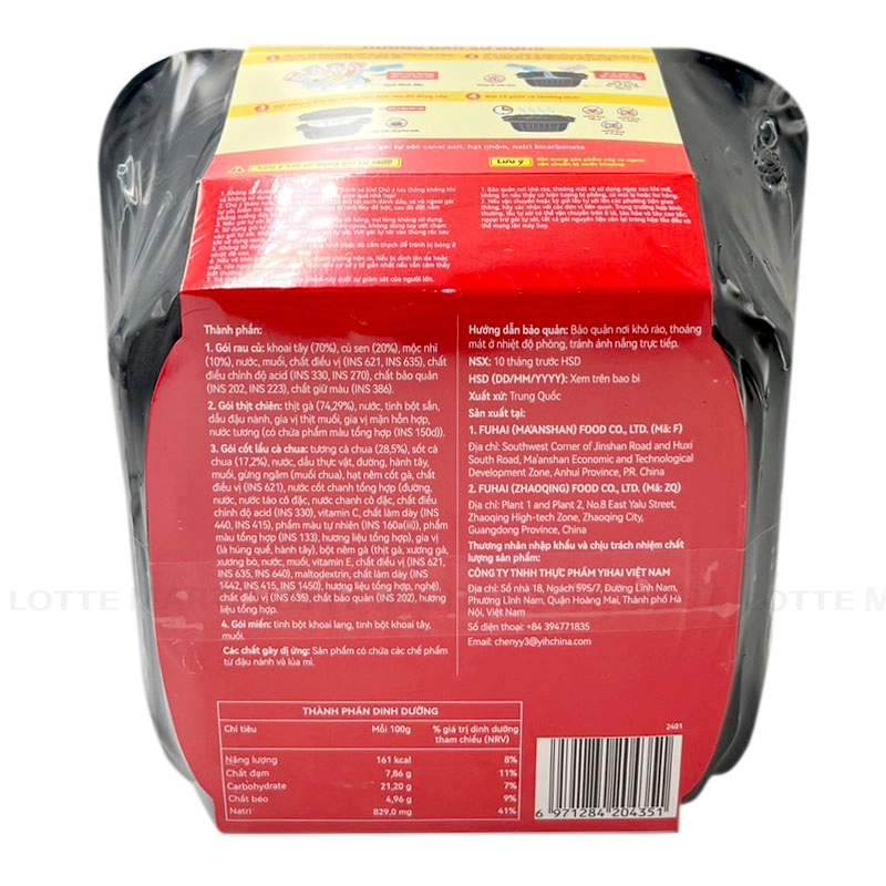 - Gói cốt lẩu cà chua: tương cà chua (28,5%), sốt cà chua (17,2%), nước, dầu thực vật, đường, hành tây, muối, gừng ngâm (muối chua), hạt nêm cốt gà, chất điều vị (INS 621), nước cốt chanh tổng hợp (đường, nước, nước táo cô đặc, nước chanh cô đặc, chất điều chỉnh độ acid (INS 330), vitamin C, chất làm dày (INS 440, INS 415), phẩm màu tự nhiên (INS 160a(ii), phẩm màu tổng hợp (INS 133), hương liệu tổng hợp), gia vị (lá húng quế, hành tây), bột nêm gà (thịt gà, xương gà, xương bò, nước, muối, vitamin E, chất điều vị (INS 621, INS 635, INS 640), maltodextrin, chất làm dày (INS 1442, INS 415, INS 1450), hương liệu tổng hợp, nghệ), chất điều vị (INS 635), chất bảo quản (INS 202), hương liệu tổng hợp.