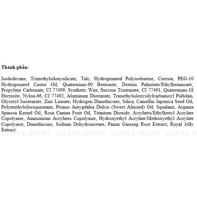 Isododecane, Trimethylsiloxysilicate, Talc, Hydrogenated Polyisobutene, Ceresin, PEG-10 Hydrogenated Castor Oil, Quaternium-90 Bentonite, Dextrin Palmitate/Ethylhexanoate¸ Propylene Carbonate, CI 77499, Synthetic Wax, Sucrose Tristearate, CI 77491, Quaternium-18 Hectorite, Nylon-66, CI 77492, Aluminum Distearate, Trimethylsiloxysilylcarbamoyl Pullulan, Glyceryl Isostearate, Zinc Laurate, Hydrogen Dimethicone, Silica, Camellia Japonica Seed Oil, Polymethylsilsesquioxane, Prunus Amygdalus Dulcis (Sweet Almond) Oil, Squalane, Argania Spinosa Kernel Oil¸ Rosa Canina Fruit Oil, Titanium Dioxide, Acrylates/Ethylhexyl Acrylate Copolymer, Ammonium Acrylates Copolymer, Hydroxyethyl Acrylate/Methoxyethyl Acrylate Copolymer, Dimethicone, Sodium Dehydroacetate, Panax Ginseng Root Extract, Royal Jelly Extract.