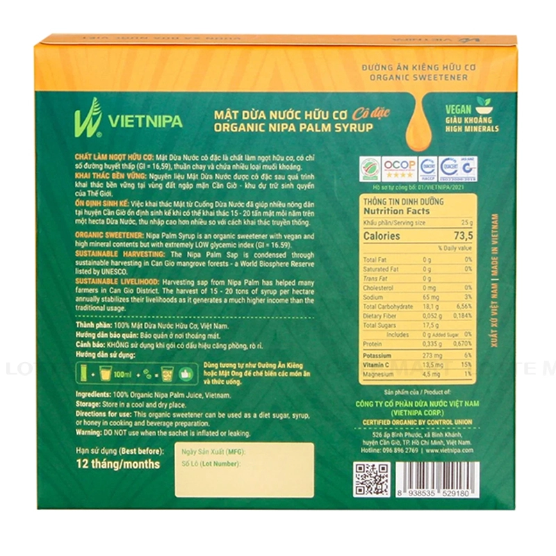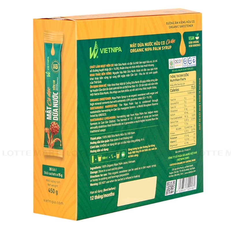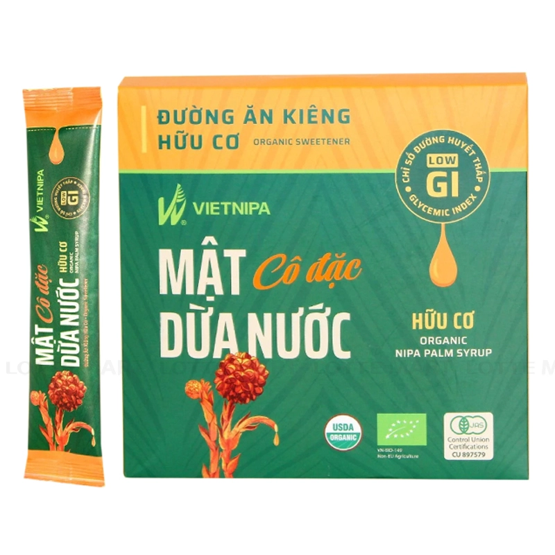 - Mật Dừa Nước Hữu Cơ Cô Đặc Vietnipa mang đến vị ngọt thơm đậm đà, xen lẫn vị mặn đặc trưng nhờ hàm lượng muối khoáng cao. Đây là một lựa chọn lý tưởng cho những ai tìm kiếm một chất làm ngọt thuần chay, thay thế cho đường và mật ong. Sản phẩm phù hợp cho mọi gia đình, đặc biệt là những người ăn chay hoặc đang trong chế độ ăn kiêng.