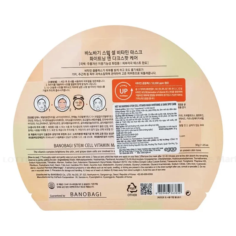 Mặt nạ Banobagi Stem Cell Vitamin Mask Whitening And Dark Spot Care chống nhăn da, trắng da, mờ nám (30g)