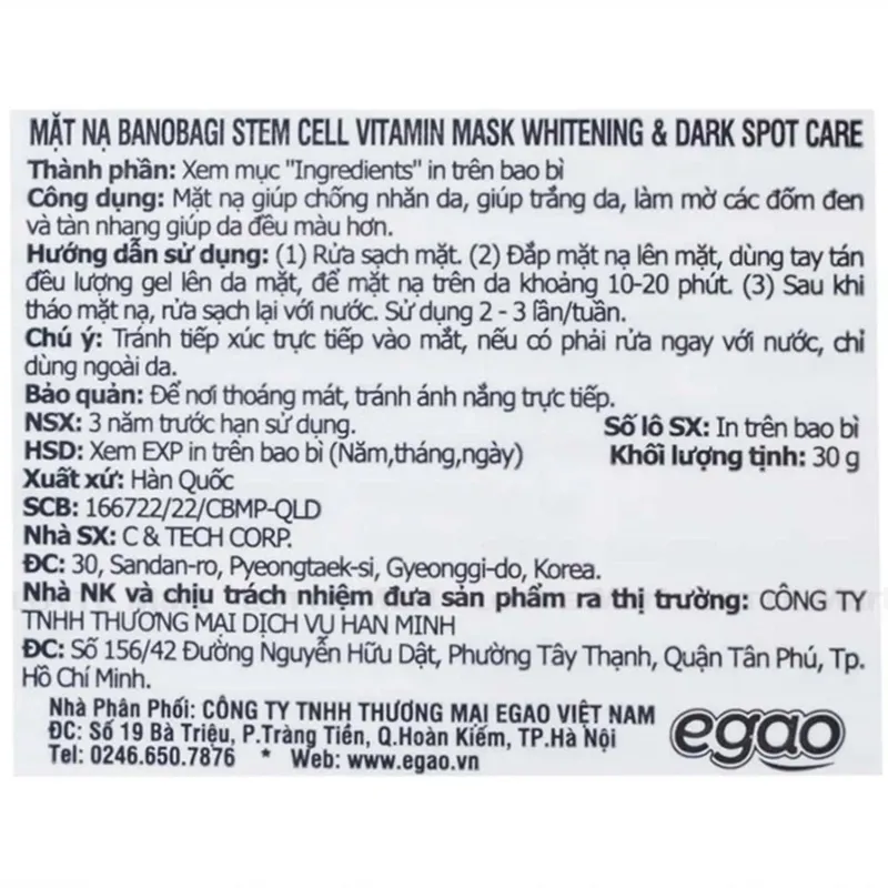- Mặt Nạ Banobagi Whitening & Dark Spot Care Dưỡng Sáng Da Mờ Thâm Nám 30g chứa chiết xuất tế bào gốc từ trái nho giúp làm mờ các đốm nâu, vết thâm, tàn nhang trên da.