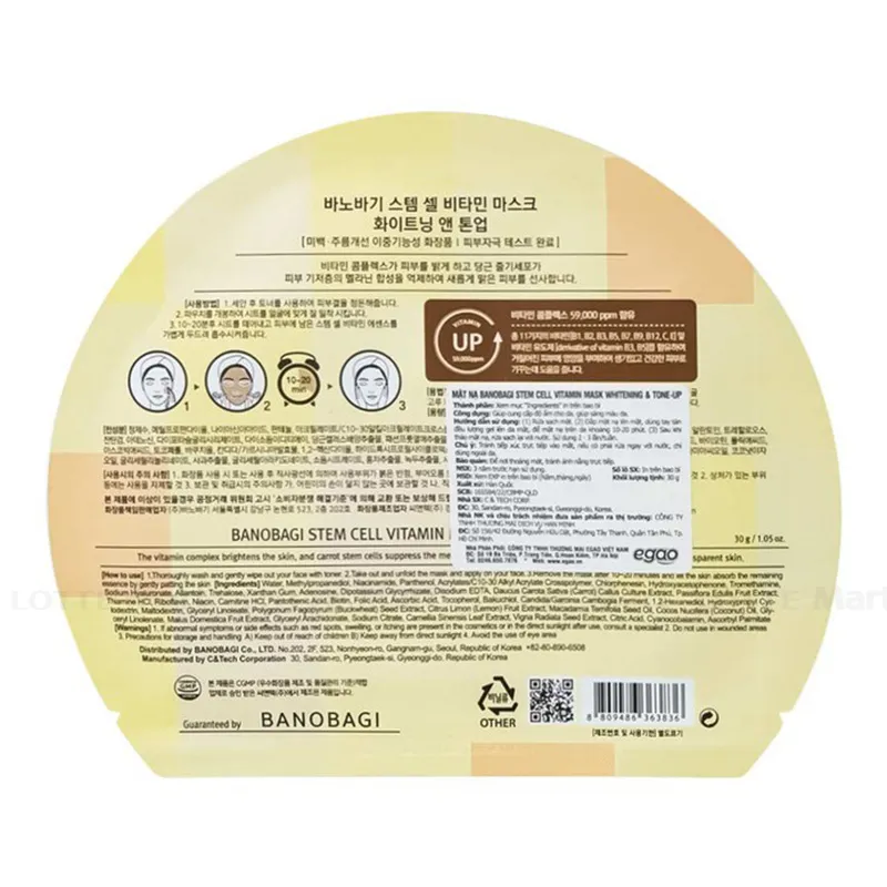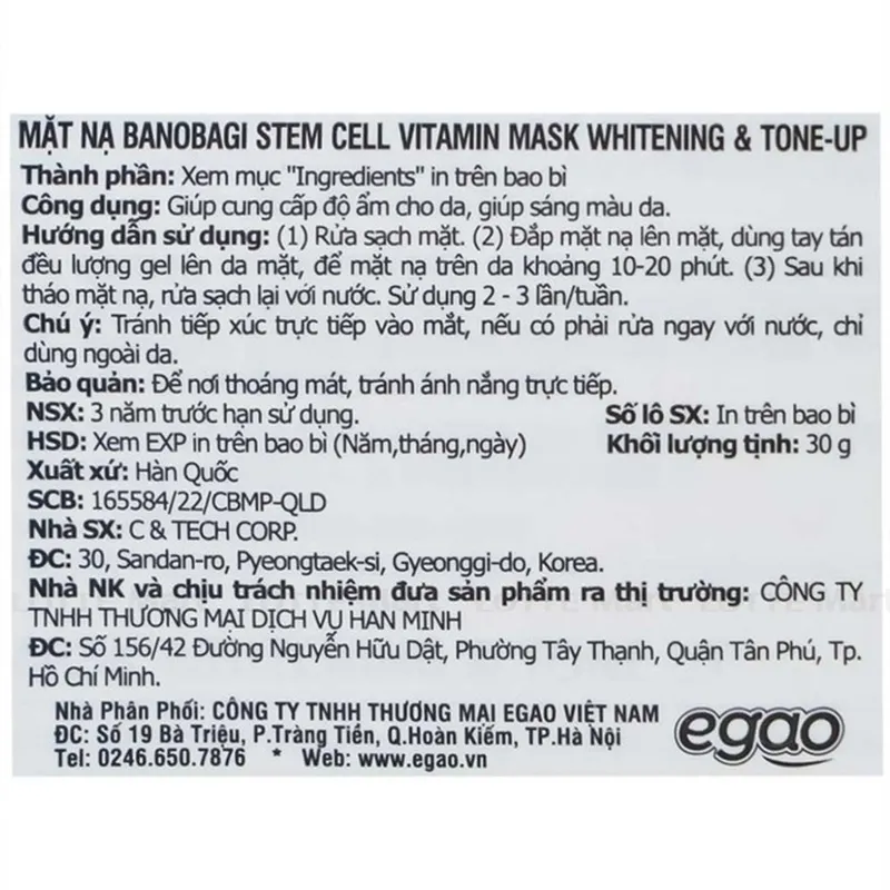 - Mặt Nạ Banobagi Stem Cell Vitamin Mask Whitening & Tone Up Làm Trắng Da phức hợp vitamin hàm lượng cao đến 20.000ppm có tác dụng dưỡng sáng da.