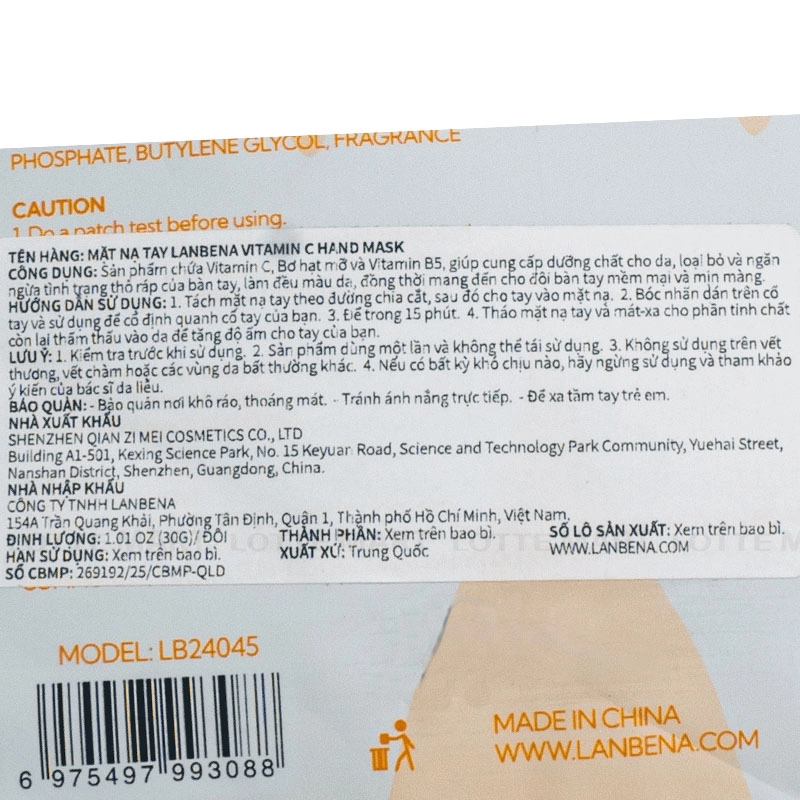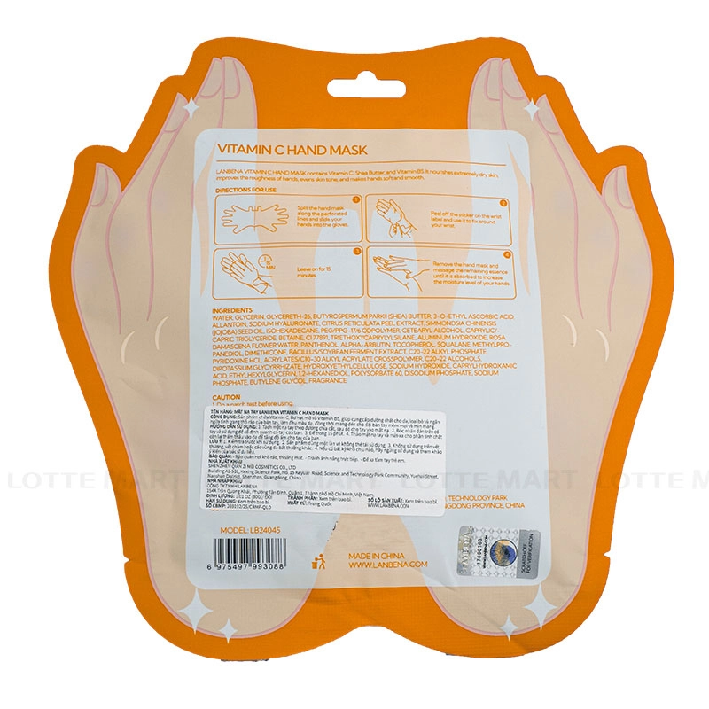 Mặt Nạ Tay Lanbena Vitamin C Đều Màu Da kết hợp axít hữu cơ thực vật và Vitamin C.