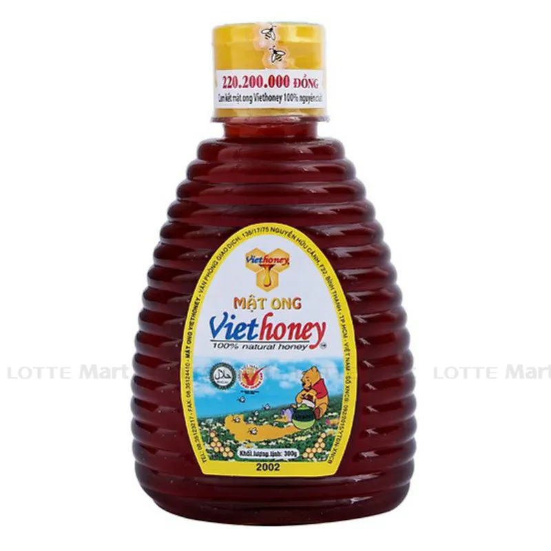 - Mật Ong Viethoney Chai 300G có thành phần tự nhiên, không chứa chất bảo quản độc hại, an toàn cho sức khỏe. Sản phẩm có tác dụng rất tốt trong việc kháng khuẩn, giảm đau, giúp vết thương mau lành, giảm ho, ngăn ngừa viêm họng…