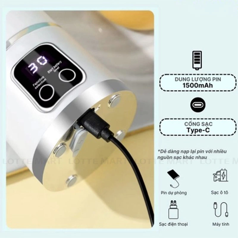- Cổng sạc Type-C mang lại sự tiện lợi khi có thể sạc nhanh và dễ kết nối ở bất kỳ đâu. Bên trong là bộ 12 lưỡi dao bằng thép không gỉ sắc bén, giúp xay mịn nguyên liệu và giữ trọn hương vị tươi ngon. Máy còn được trang bị màn hình LCD cảm ứng hiển thị rõ ràng mức pin và chế độ hoạt động, thao tác đơn giản chỉ với một chạm.