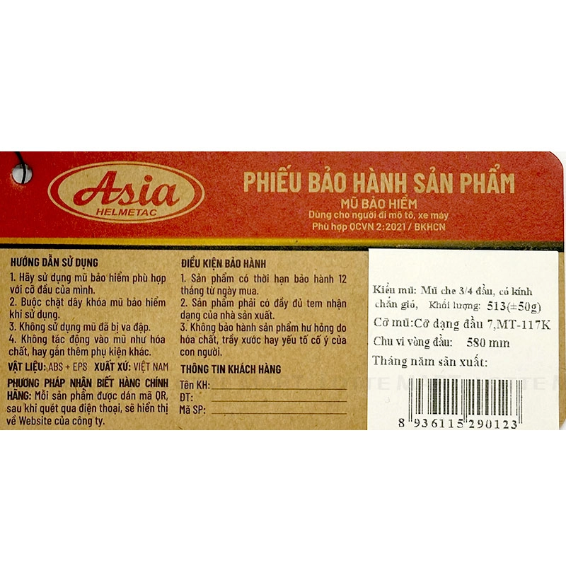 - Mũ Bảo Hiểm Asia Nửa Đầu Có Kính MT-117K Size L được làm từ vỏ ABS chắc chắn chống va đập cho đầu.