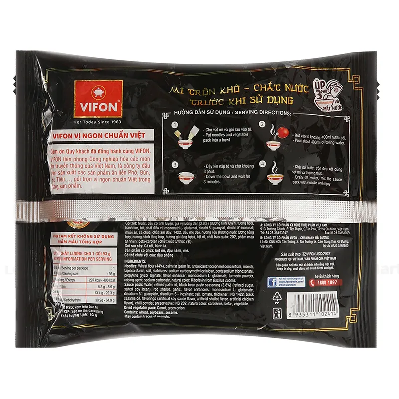 - Gói xốt - Nước, dầu cọ, đường tinh luyện, gia vị tương đen, hành tím, tỏi, chất điều vị, cà chua, chất làm dày, dầu mè đen, bột ớt...