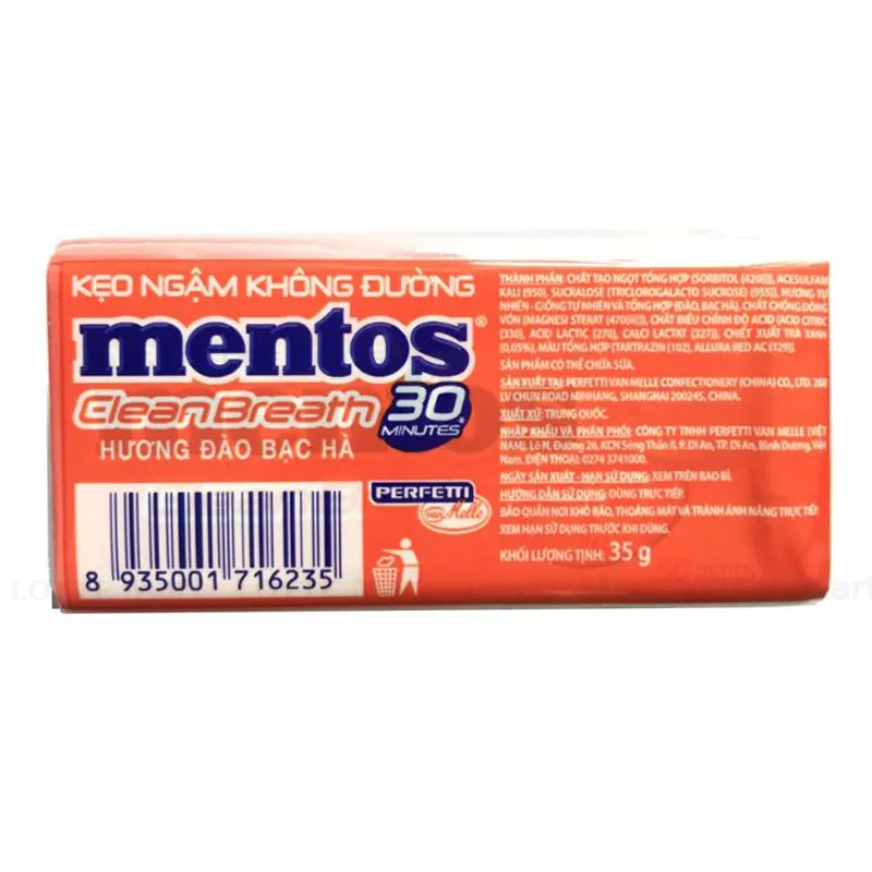 - Kẹo Ngậm Không Đường Mentos Hương Đào Bạc Hà có hương bạc hà và chiết xuất đào mang lại hơi thở thơm mát và cảm giác sảng khoái khi thưởng thức. Sản phẩm không đường phù hợp với người ăn kiêng.