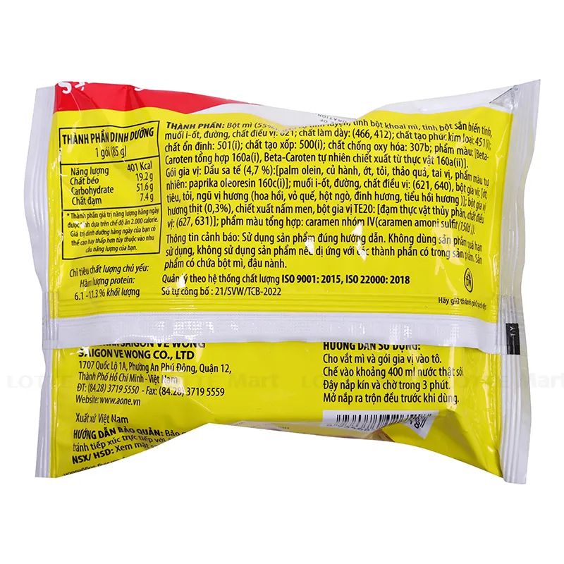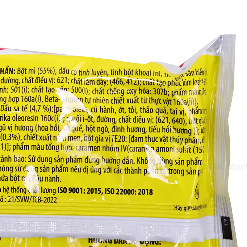 - GÓI GIA VỊ - Dầu olein, muối I-ốt, đường, chất điều vị (621, 640), gia vị (bột ớt, bột tiêu, bột tỏi, bột ngũ vị hương (hoa hồi, vỏ quế, hột ngò, đinh hương, tiêu hồi hương)), sa tế (7 g/kg) (củ hành chiết xuất, ớt chiết xuất, tỏi chiết xuất, thảo quả chiết xuất, tai vị chiết xuất), bột hương thịt tự nhiên (3 g/kg), nguyên liệu thực phẩm chiết xuất nấm men dạng bột, bột gia vị TE20, phẩm màu (150d), (160c).
