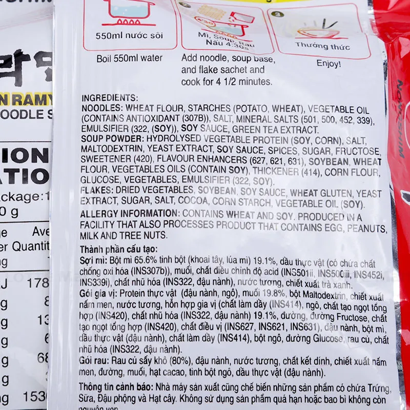 - Sợi mì: Bột mì 62.70%, tinh bột khoai tây 19.12%, dầu cọ 17.02%, muối 0.78%, muối khoáng (339, 500, 501) 0.27%, gia vị (chiết xuất nấm men, xốt tương, tỏi, tinh bột) 0.10%, chiết xuất trà xanh 0.008%, màu (101) 0.002%.