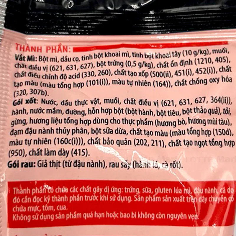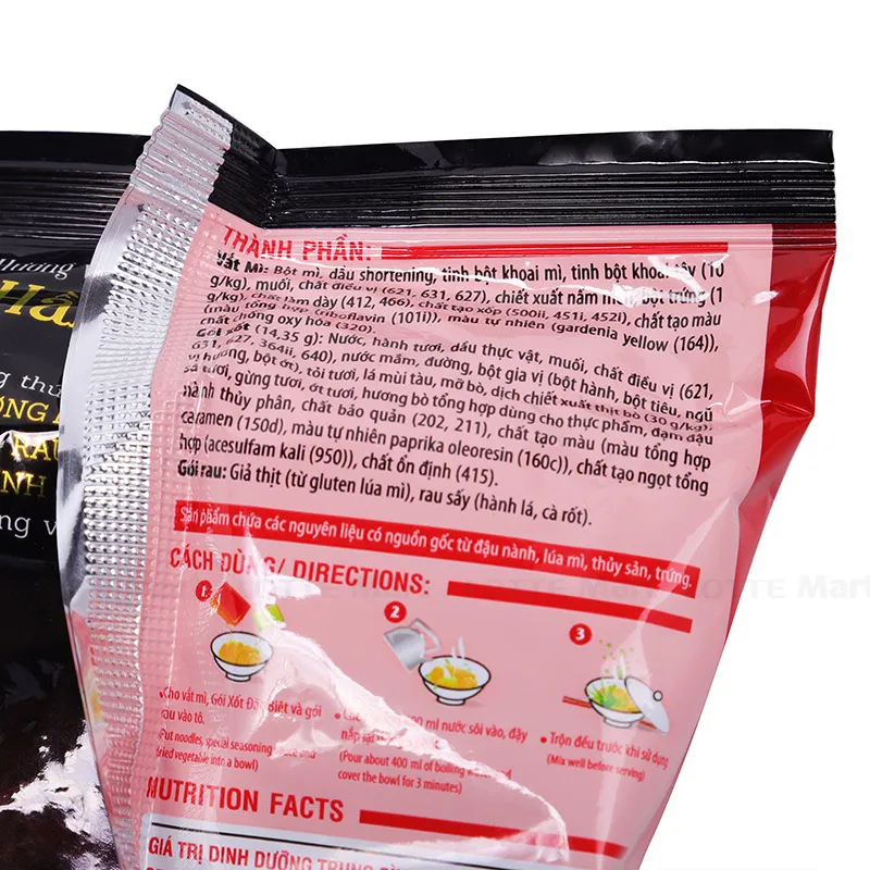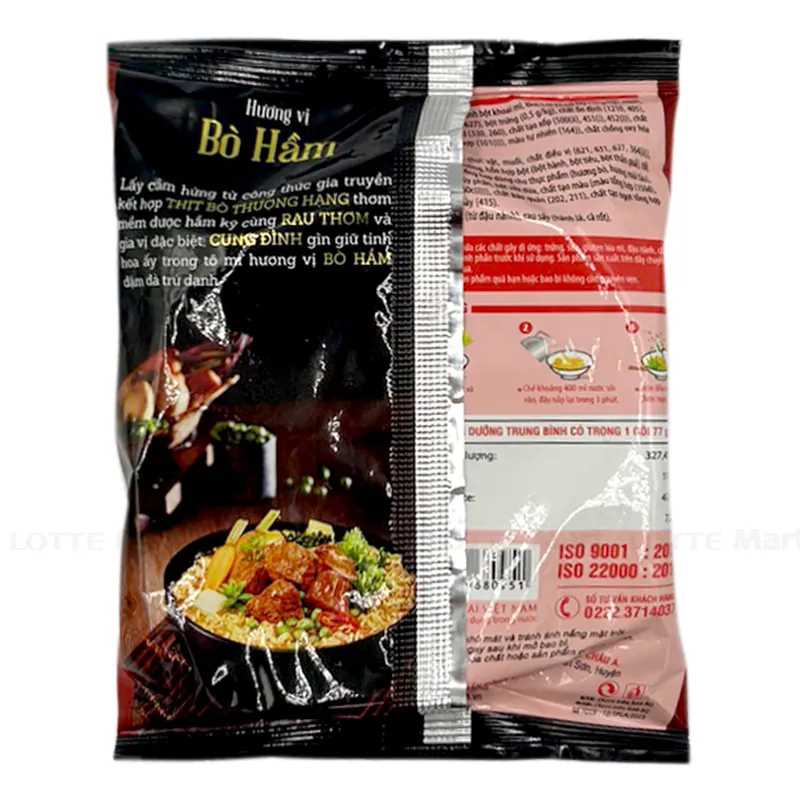 Mì Khoai Tây Cung Đình Bò Hầm là một sản phẩm đến từ thương hiệu nổi tiếng tại Việt Nam. Sản phẩm được làm từ các nguyên liệu tươi ngon, nguyên chất có hương vị bò hầm thơm ngon, độc đáo, hấp dẫn, không chứa chất bảo quản và an toàn cho người sử dụng. Thành phần: Bột mì, dầu shortening, tinh bột khoai mì, tinh bột khoai tây (10g/kg), muối, chiết xuất bò hầm, đường, hành tươi, tỏi tươi, nước tương, hương mùi tàu, hành sấy, cà rốt sấy...Hướng dẫn sử dụng: Cho mì và các gói gia vị vào bát. Chế khoảng 300ml nước sôi, đậy nắp chờ trong 3 - 4 phút, sau đó trộn đều và thưởng thức. Hướng dẫn bảo quản: Bảo quản nơi khô thoáng, tránh ánh nắng trực tiếp.