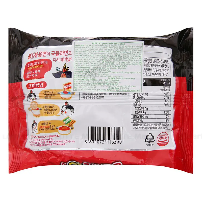 - GÓI SÚP - Nước 39.827%, bột ớt 15.380%, đường 11.762%, chất điều vị (E621) 8.274%, xốt tương 6.127%, muối 4.330%, tinh bột sắn 4.059%, chất điều vị (E635) 2.629%, tỏi 2.450%, dầu đậu nành 1.532%, hành 1.225%, paprika (E160c) 0.858%, bột chives 0.613%, chiết xuất nấm men 0.566%, bột tiêu 0.368%.