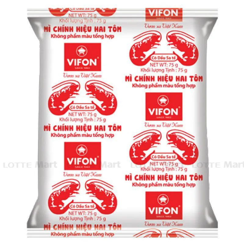 Mì Gói Chính Hiệu Hai Tôm Vifon 75G được làm từ bột mì, dầu thực vật tinh luyện, muối đường, chất điều vị, hương tổng hợp, ớt, tiêu, tỏi… đã qua quá trình kiểm định độ an toàn cho sức khỏe người dùng.