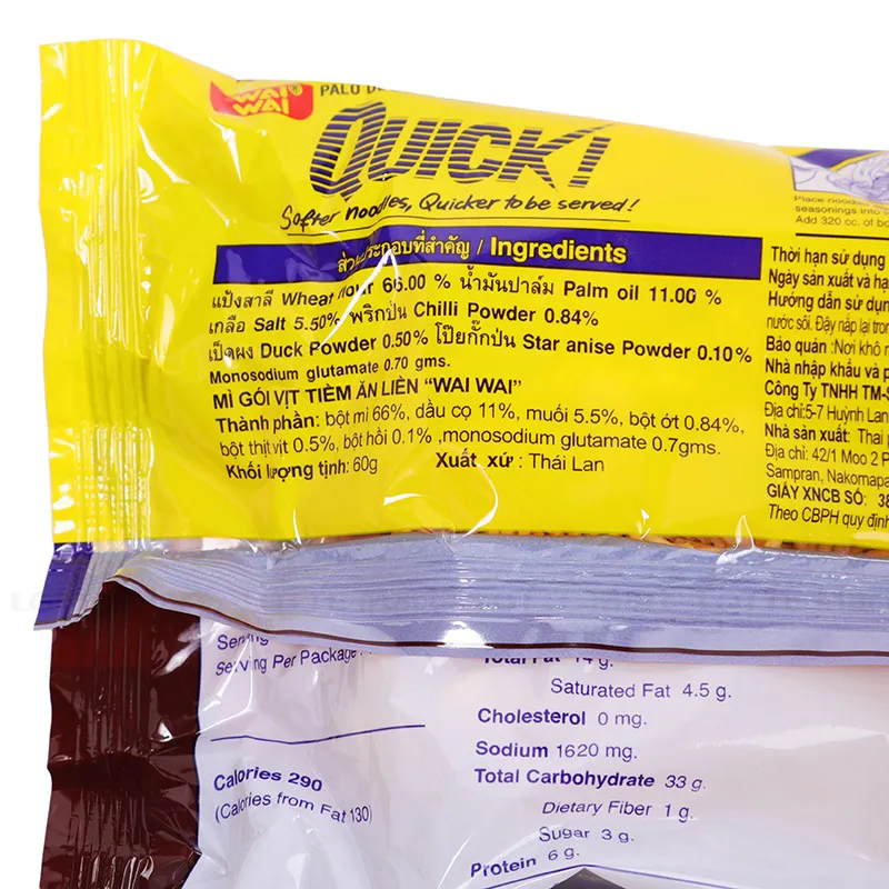 Bột mì, dầu cọ, dầu nành, gia vị, hương vịt, bột tỏi, bột ớt, bột ngọt. Cho mì và các gói gia vị vào tô, cho nước sôi vừa đủ, đậy nắp, chờ 3 phút và thưởng thức. Bảo quản nơi khô ráo thoáng mát, tránh ánh nắng trực tiếp.