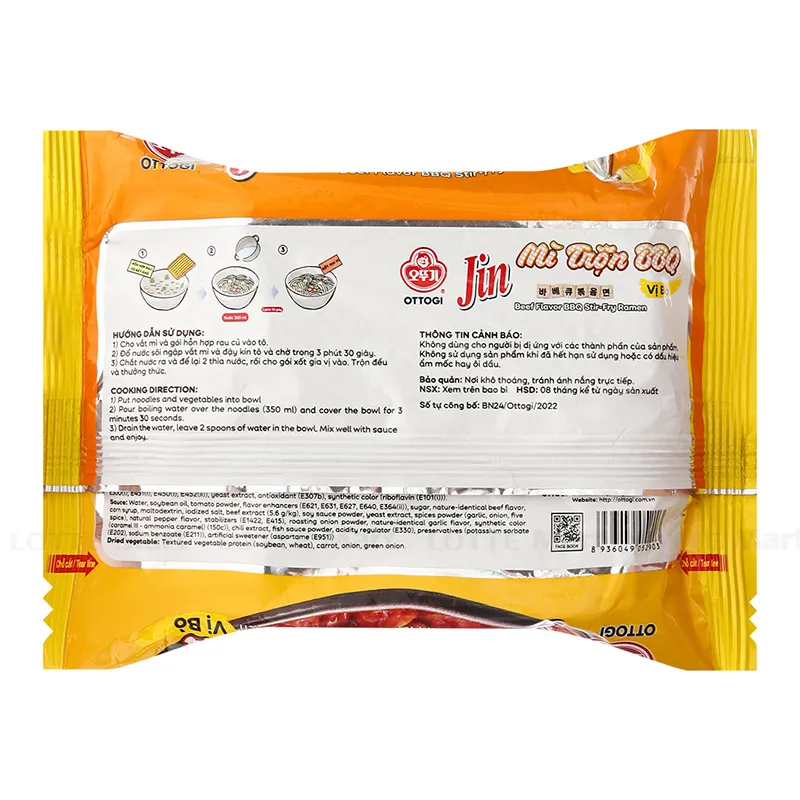 - Xốt gia vị: Nước, dầu đậu nành, bột cà chua, chất điều vị, hương liệu bò giống tự nhiên, xi-rô ngô, maltodextrin, muối i-ốt, chiết xuất bò (5.6g/kg), bột nước tương, chiết xuất nấm men, bột gia vị (tỏi, hành tây, ngũ vị hương), hương liệu tự nhiên, chất ổn định (INS1422, INS415), bột hành tây rang, hương liệu tỏi giống tự nhiên, phẩm màu tổng hợp, chiết xuất ớt, bột nước mắm, chất điều chỉnh độ acid (INS330), chất bảo quản, chất tạo ngọt tổng hợp,...