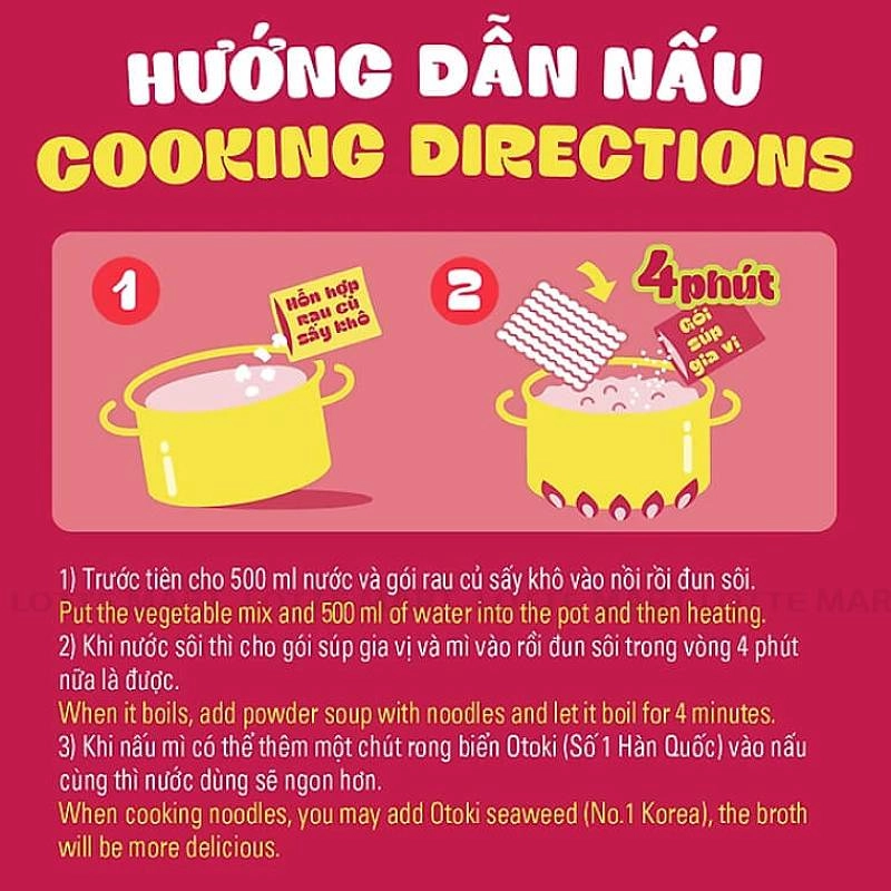 - Cho hỗn hợp rau củ sấy vào 550ml nước nấu sôi. Sau đó cho mì và gói bột súp vào nấu tiếp khoảng 4 phút và thưởng thức. Có thể thêm kim chi, hành lá, trứng... tùy thích.
