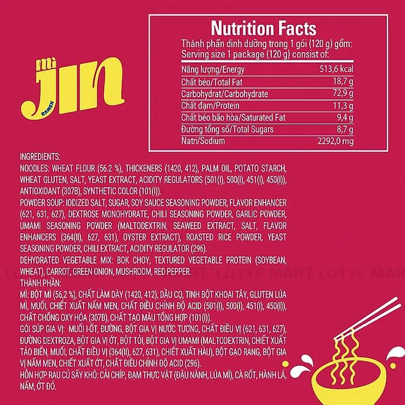 - Mì Jin Cay Ottogi (120g) được làm từ các nguyên liệu chính gồm Bột mì, dầu cọ, tinh bột khoai tây, muối, đường, bột thịt bò và các thành phần khác.