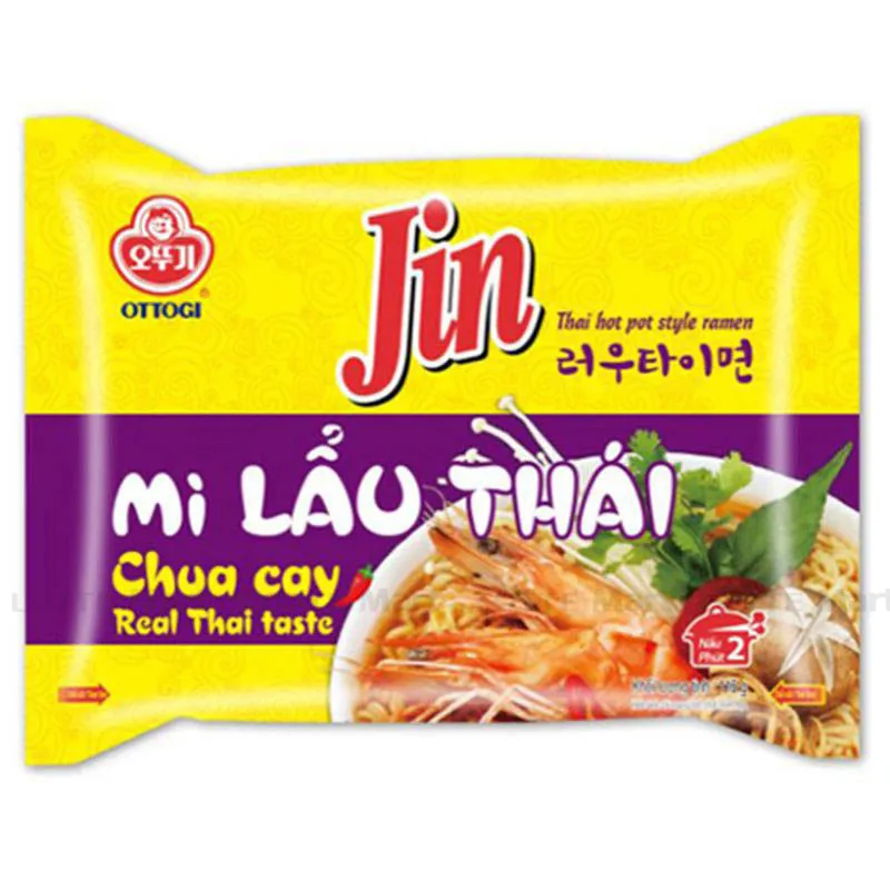 Mì Jin lẩu Thái là một sản phẩm đặc biệt mà tập đoàn Ottogi sản xuất dành riêng cho các fan hâm mộ của đội tuyển bóng đá Việt Nam nhằm ủng hộ tinh thần cho các chàng trai sân cỏ và huấn luận viên Park Hang Seo trong trận đấu gặp Thái Lan tại Sea Games 30. Sợi mì vàng dai, cọng nhỏ kết hợp cùng với nước dùng chua cay đậm đà, siêu kích thích, mì Jin lẩu Thái chắc chắn sẽ khiến mọi người hì hục chén sạch đến sợi cuối cùng.