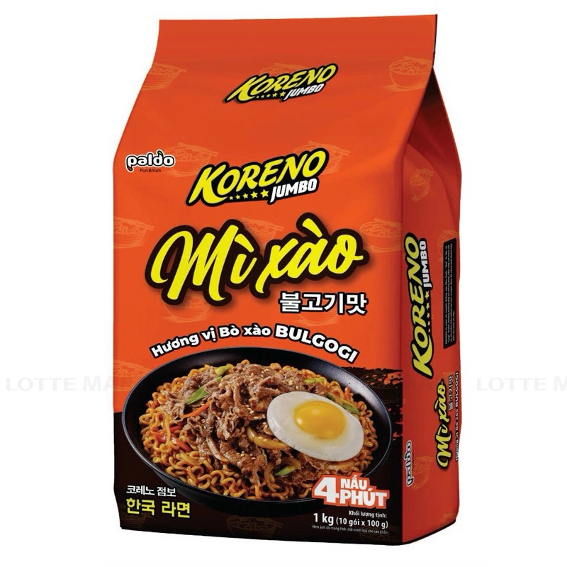 - Mì Jumbo Xào Vị Bò Bulgogi Gói 1Kg là sự kết hợp hoàn hảo giữa sợi mì Koreno dai ngon trứ danh cùng sốt gia vị bò nướng độc đáo. Sợi mì dày dặn, dai ngon, thấm đẫm gia vị cùng nước sốt Bulgogi đậm đà, thơm lừng mang đến hương vị đặc trưng của món bò nướng Bulgogi Hàn Quốc.