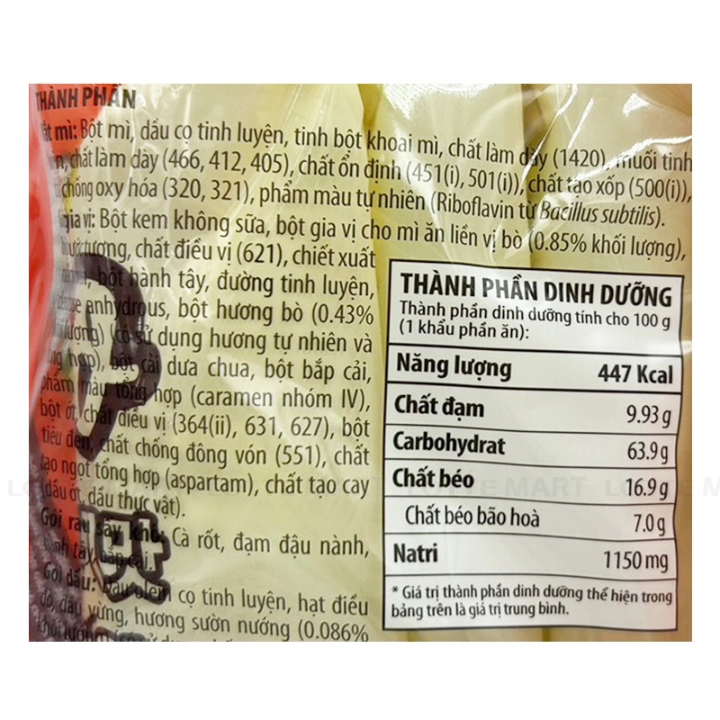 - Gói gia vị: Bột kem không sữa, bột gia vị cho mì ăn liền vị bò (0.85% khối lượng), bột nước tương, chất điều vị (621), chiết xuất nấm men, bột hành tây, đường tinh luyện, dextrose anhydrous, bột hương bò (0.43% khối lượng) (có sử dụng hương tự nhiên và tổng hợp), bột cải dưa chua, bột bắp cải, phẩm màu tổng hợp (caramen nhóm IV), bột ớt, chất điều vị (364(ii), 631, 627), bột tiêu đen, chất chống đông vón (551), chất tạo ngọt tổng hợp (aspartam), chất tạo cay (dầu ớt, dầu thực vật).