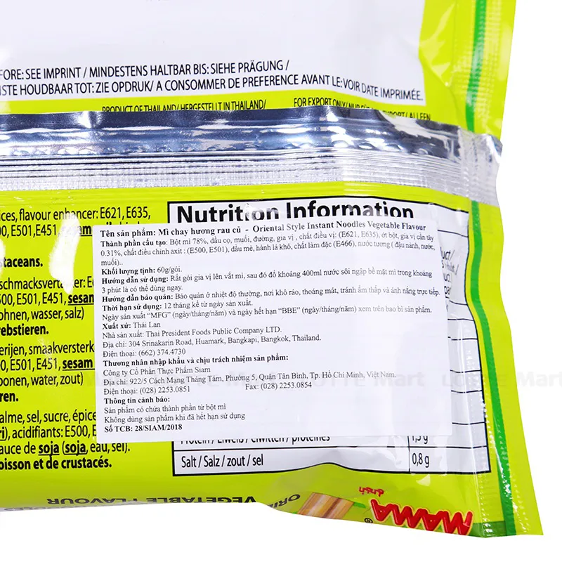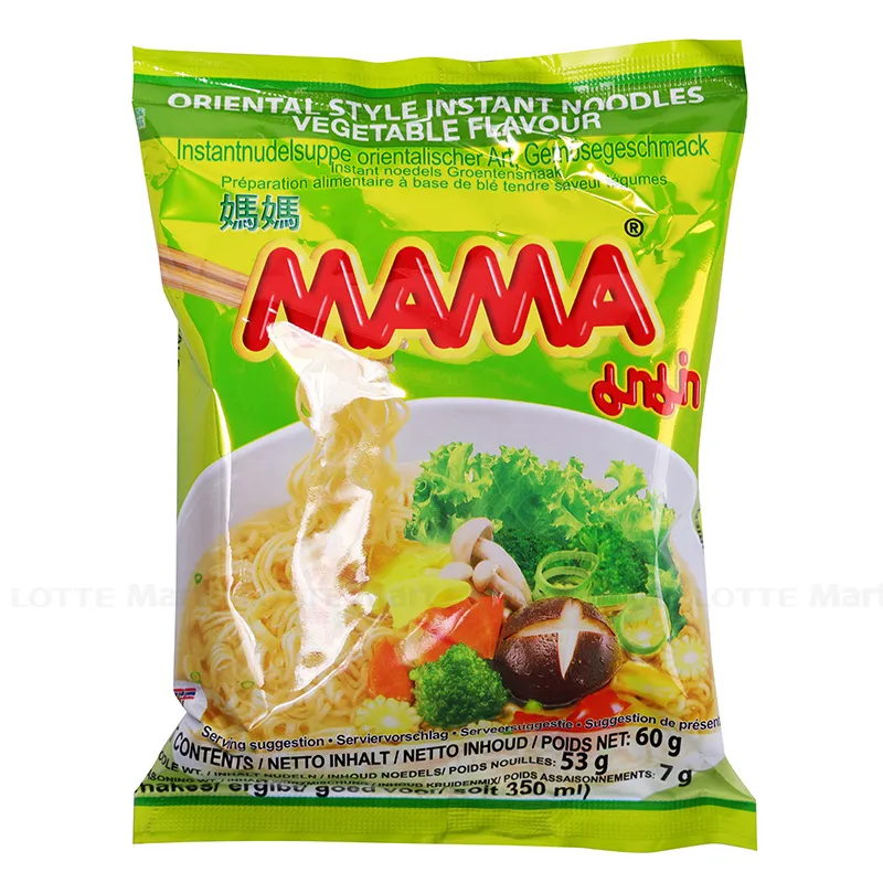 Mì Mama Chay Rau Củ Gói 60G được sản xuất trên dây chuyền công nghệ hiện đại, có hương vị thơm ngon, đảm bảo vệ sinh an toàn thực phẩm, an toàn cho sức khỏe. Mì là sản phẩm thích hợp dành cho người ăn chay. Thành phần: Bột mì, dầu cọ, muối, đường,...Hướng dẫn sử dụng: Cho vắt mì và các gói gia vị vào tô. Chế nước sôi vào khoảng 400ml, đậy nắp lại và chờ 3 phút. Trộn đều và dùng được ngay. Hướng dẫn bảo quản: Bảo quản nơi khô ráo, thoáng mát.