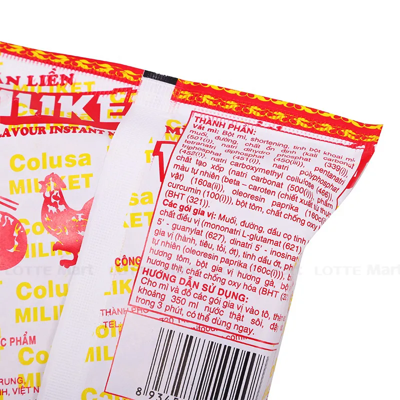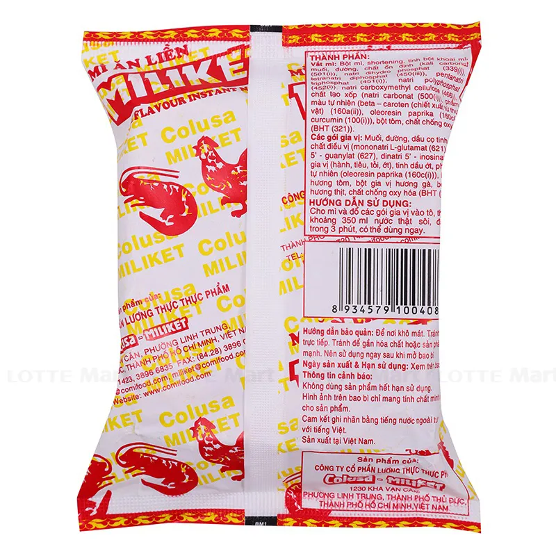 VẮT MÌ - Bột mì, shortening, tinh bột khoai mì, muối I-ốt, đường, tôm, chất ổn định (501(i), 452(i), 466), chất tạo xốp (500(i)), phẩm màu tự nhiên (160a(ii), 160c, 100(i)), chất chống oxy hoá (321).