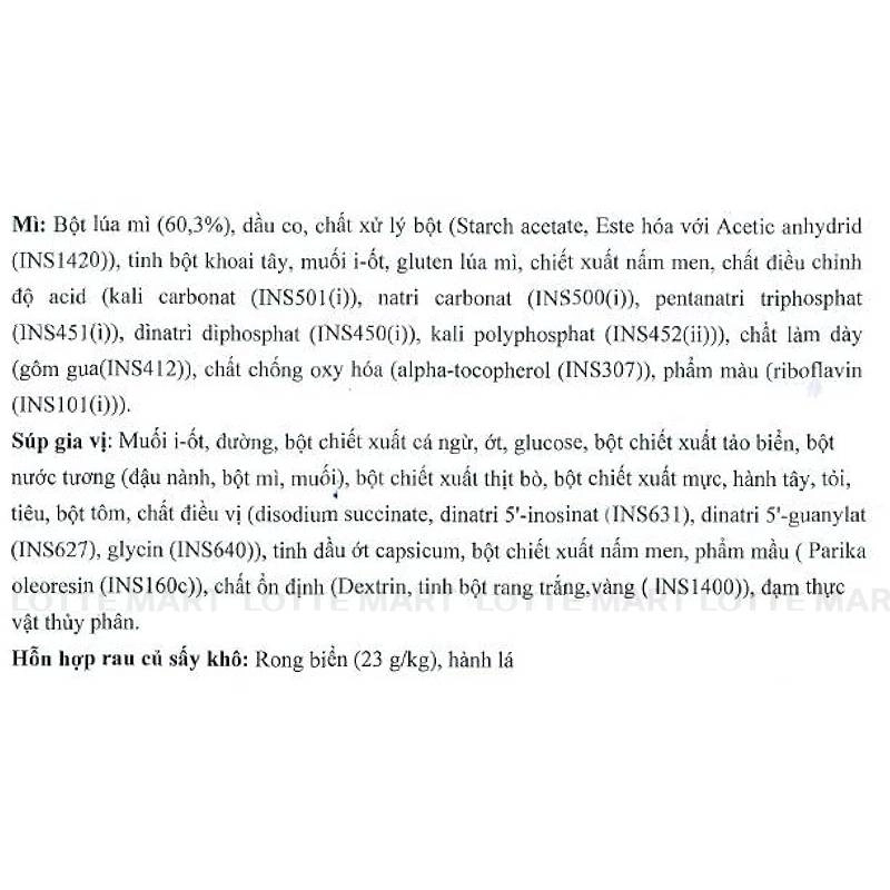 Thành phần: MÌ - Bột lúa mì, chất làm dày, dầu cọ, tinh bột khoai tây, gluten lúa mì, muối i - ốt, chất điều chỉnh độ acid, chiết xuất nấm men... XỐT GIA VỊ - Bột chiết xuất mực, bột gia vị cá ngừ, bột chiết xuất tảo biển, đường, muối i - ốt, bột nước tương, bột chiết xuất thịt bò, bột tôm... Cách dùng: Trước tiên cho 550ml nước vào nồi và gói rau củ sấy khô vào đun sôi. Khi nước sôi thì cho gói súp gia vị và mì vào rồi đun sôi khoảng 5 phút là được. Sản xuất tại Việt Nam.