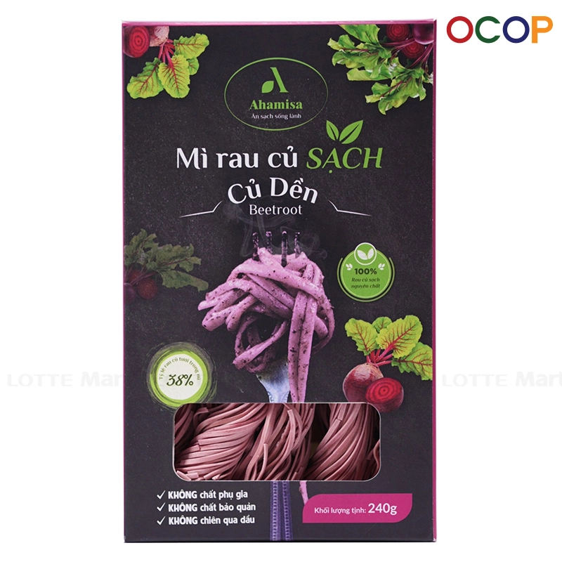 - Mì Rau Củ Sạch Củ Dền Ahamisa Gói 240G được ra đời trong quy trình khép kín, mệnh danh là "Món Ăn Của Sự Nguyên Bản" đến từ thiên nhiên. Mì đạt tiêu chuẩn 4K: Không chiên qua dầu, không phụ gia, không phẩm màu và không chất bảo quản. Đồng thời, tỷ lệ rau củ tươi trong mì lên đến 38% cung cấp nhiều vitamin và khoáng chất. Mì rau củ Ahamisa trở thành lựa chọn ưu tiên cho những bữa ăn ngon của gia đình.