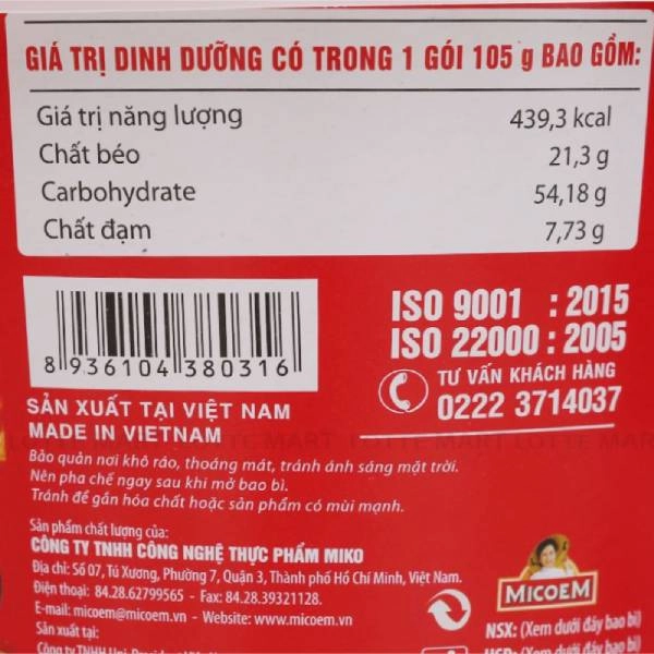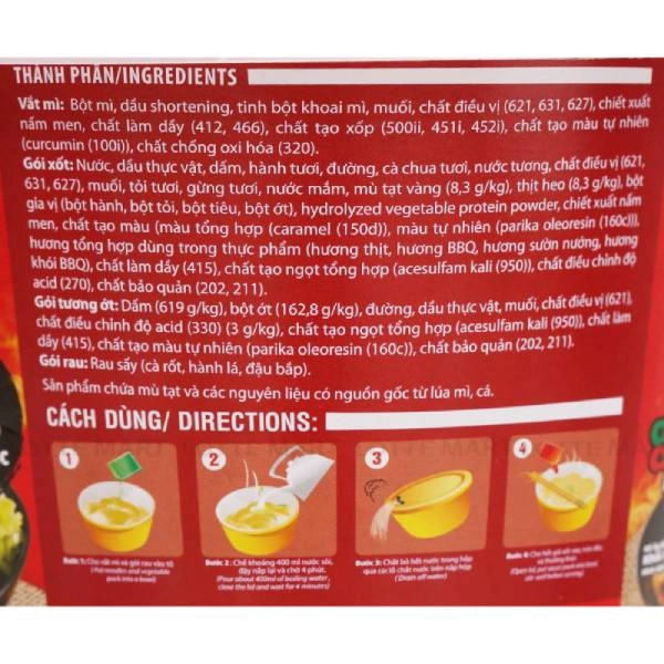 - VẮT MÌ - Bột mì, dầu shortening, tinh bột khoai mì, muối, chất điều vị (E621, E631, E627), chiết xuất nấm men, chất làm dầy, chất tạo xốp, chất tạo màu tự nhiên, chất chống oxy hoá.
