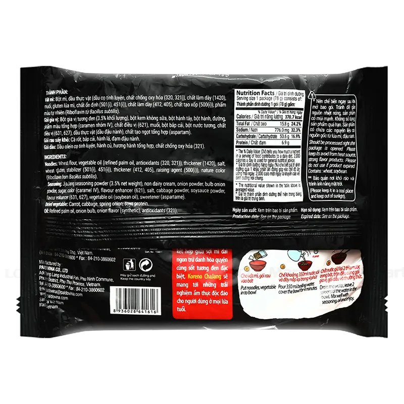 Hướng dẫn sử dụng:Cho vắt mì, gói rau vào bát. Chế khoảng 350ml nước sôi và đậy nắp lại trong 4 phút. Chắt nước giữ lại 2-3 thìa nước trong bát, trộn đều cùng gói gia vị, gói dầu và thưởng thức. Hướng dẫn bảo quản: Để nơi khô ráo, thoáng mát tránh ánh nắng mặt trời.