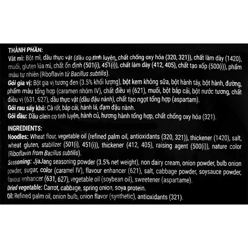 Gói gia vị - Bột gia vị tương đen (3.4% khối lượng), bột kem không sữa, bột hành tây, bột hành, đường, phẩm màu tổng hợp (caramen nhóm IV), chất điều vị (621), bột bắp cải, muối, bột nước tương, chất điều vị (631, 627), chất tạo ngọt tổng hợp (aspartam).