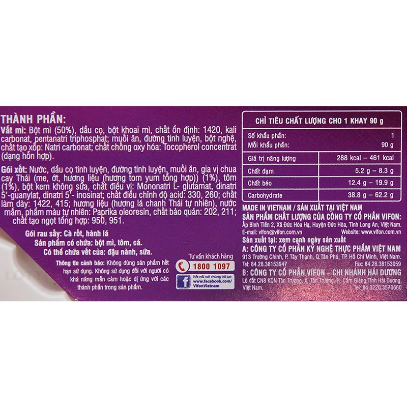 - Gói xốt: Nước, dầu cọ, đường tinh luyện, muối ăn, gia vị chua cay Thái (me, ớt, hương liệu tomyum tổng hợp, tôm, bột kem không sữa, chất điều vị, chát làm dày,...
