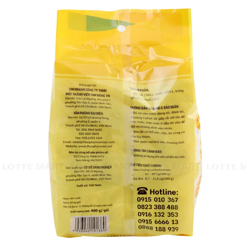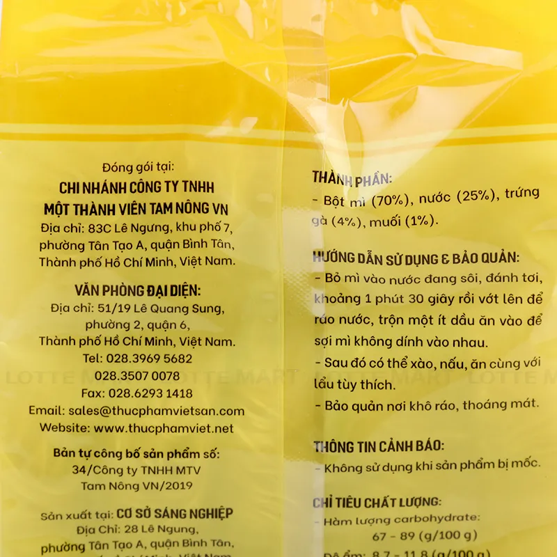 - Mì Trứng Tam Nông Gói 400G có thành phần chính được làm từ bột mì và trứng, kết hợp cùng công thức chế biến độc đáo giúp mang đến cho người tiêu dùng sợi mì dai ngon, thơm bùi dịu nhẹ vị trứng.