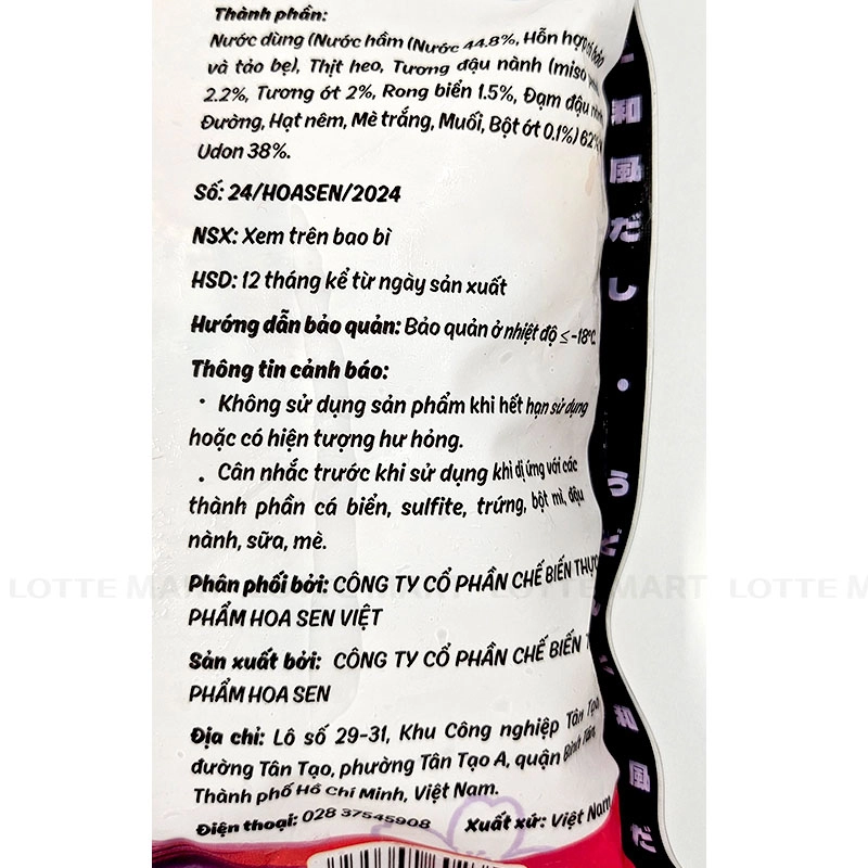 - Nước dùng (Nước hầm (Nước 44.8%, Hỗn hợp cá bào và tảo bẹ), Thịt heo, Tương đậu nành (miso paste) 2.2%, Tương ớt 2%, Rong biển 1.5%, Đạm đậu nành, Đường, Hạt nêm, Mè trắng, Muối, Bột ớt 0.1%) 62%; Mì Udon 38%.
