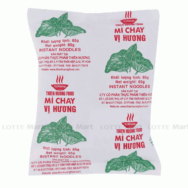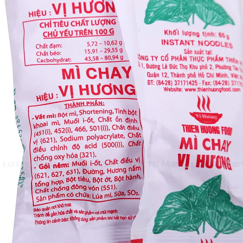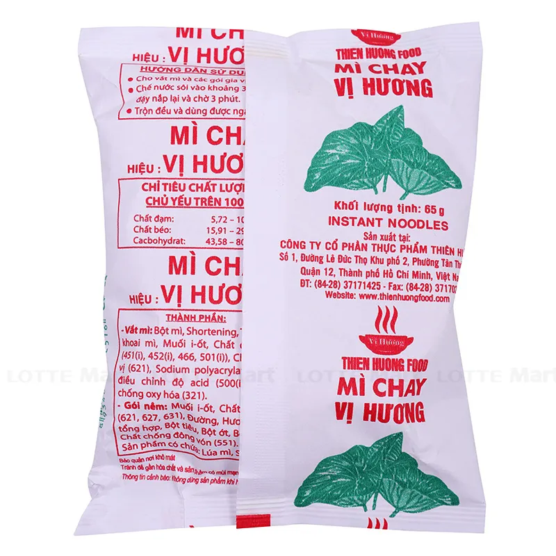 Mì Chay Vị Huơng 65G sản phẩm được chế biến từ các nguyên liệu tự nhiên, tươi ngon, giúp giữ nguyên hương vị, cho bạn một trải nghiệm ẩm thực mới mẻ. Là sản phẩm hỗ trợ đắc lực khi bận rộn không có thời gian nấu nướng, hoặc cũng có thể đem theo trong các chuyến du lịch dài ngày hay dã ngoại. Thành phần: Tinh bột khoai mì, tiêu, ớt, chất điều chỉnh độ axit, chất ổn định, hương nấm tổng hợp, chất đóng vón, màu thực phẩm tổng hợp. Hướng dẫn sử dụng: Cho vắt mì và gia vị vào tô. Chế 400ml nước sôi và đậy nắp lại. Sau 3 phút, mở nắp ra trộn đều dùng được ngay. Hướng dẫn bảo quản: Bảo quản nơi khô ráo, mát mẻ.