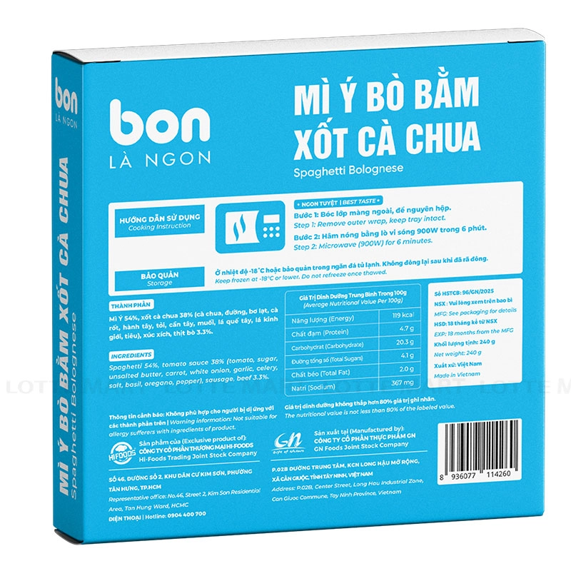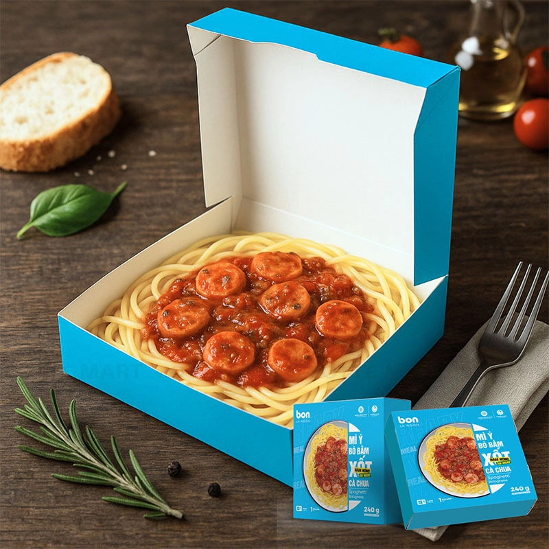 - Với thiết kế tiện dụng, khẩu vị dễ thưởng thức và thời gian chuẩn bị tối giản, Mì Ý Bò Bằm Xốt Cà Chua Bon là lựa chọn lý tưởng cho người bận rộn muốn vẫn duy trì bữa ăn ngon và chất lượng.